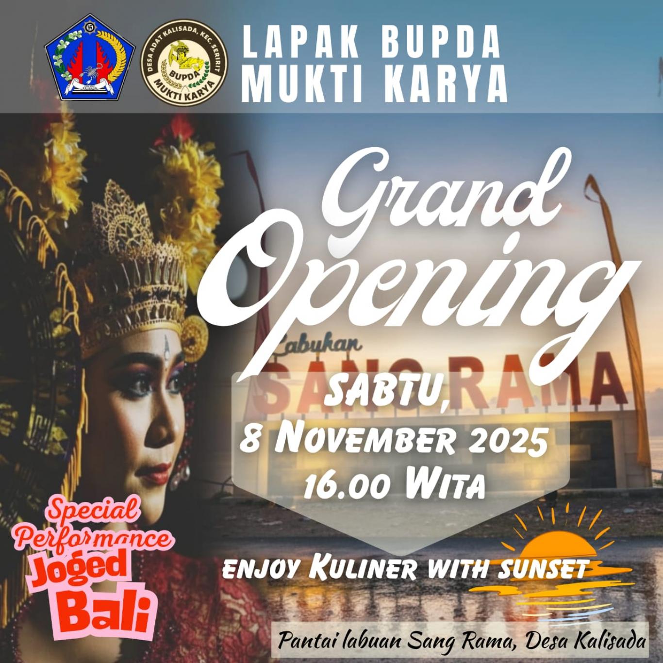 Halo semeton Desa Kalisada dan Sekitarnya, Hari ini tgl 8 November 2025 akan dilaksanakan Grand Opening "BUPDA MUKTI KARYA", wisata kuliner di Sang Rama yang akan dibuka mulai hari ini,