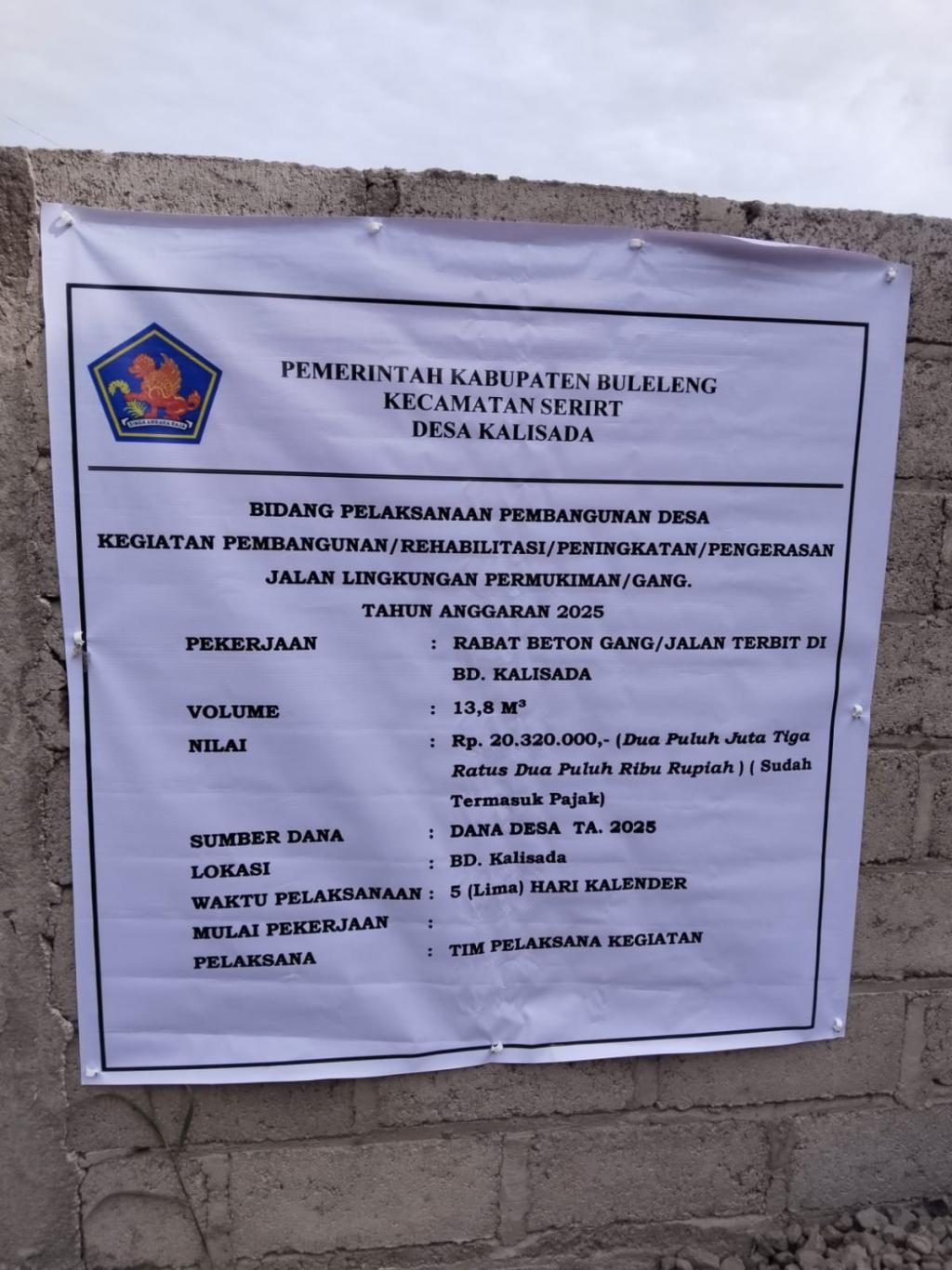 Pada hari ini, Senin 10 November 2025 Bp Kadus Br Dinas Kalisada melakukan kunjungan dan pengawan atas Kegiatan Peleksanaan Pemeliharaan Rabat Beton di Gang/Jalan Terbit Br Dinas Kalisada. Pemelihaaran Rabat beton ini merupakan kegiatan yang berdasarkan Dana Desa TA.2025. Kegiatan ini sudah terlaksana mulai hari Minggu tgl 9 november 2025.